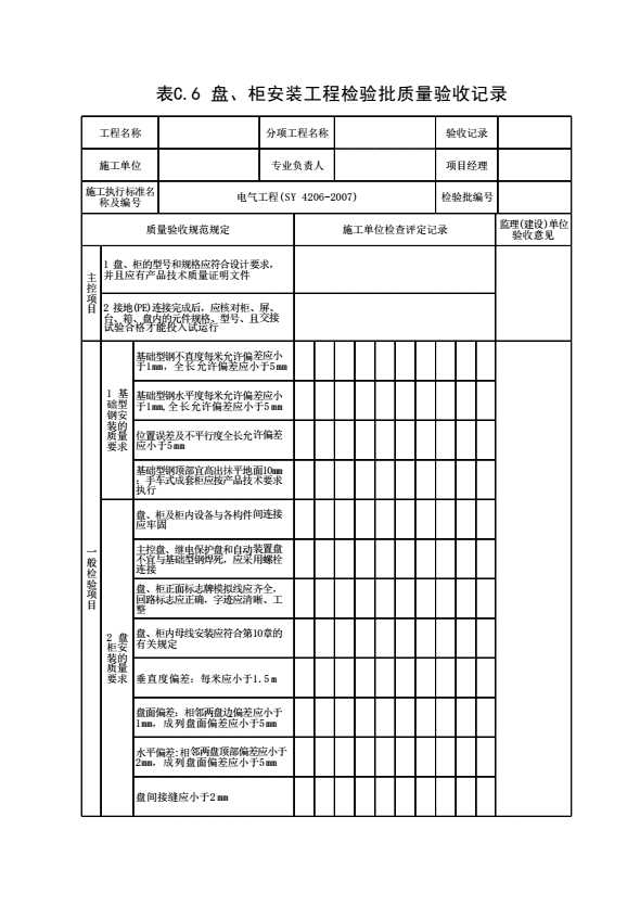表格名称:表C.6 盘、柜安装工程检验批质量验收记录