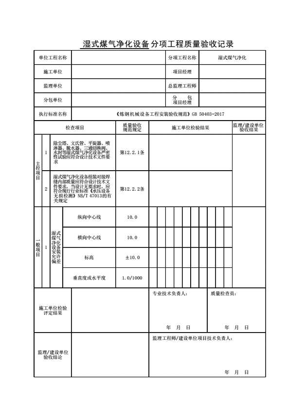 表格名称:湿式煤气净化设备分项工程质量验收记录