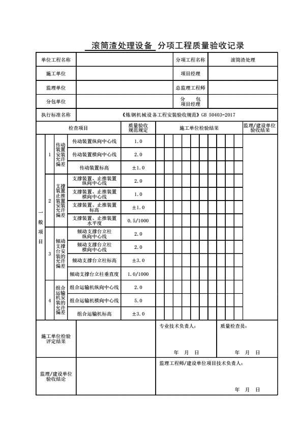 表格名称:滚筒渣处理设备分项工程质量验收记录