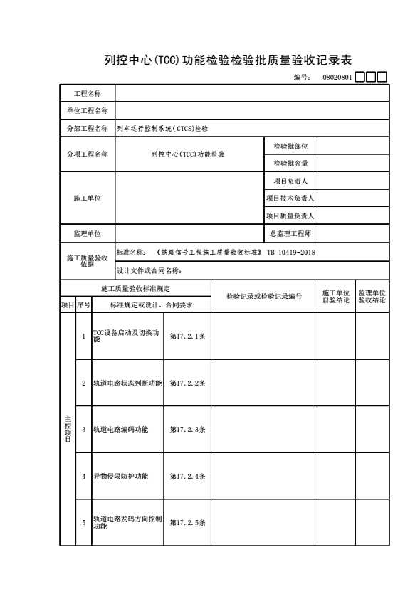 表格名称:08020801 列控中心(TCC)功能检验检验批质量验收记录表