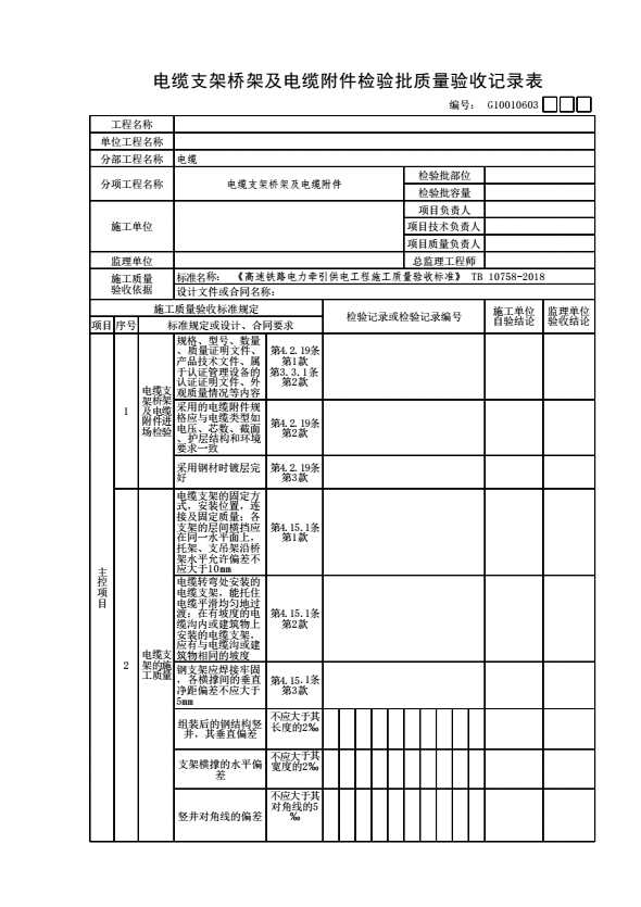 表格名称:G10010603 电缆支架桥架及电缆附件检验批质量验收记录表
