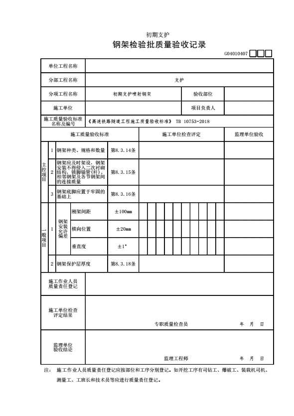 表格名称:G04010407 【初期支护】钢架检验批质量验收记录
