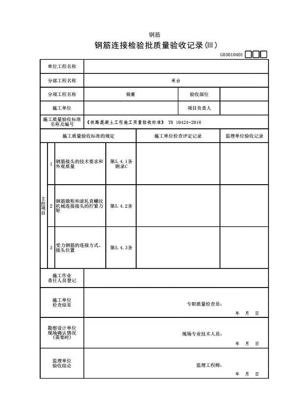 表格名称:G03010401 【钢筋】钢筋连接检验批质量验收记录(Ⅲ)