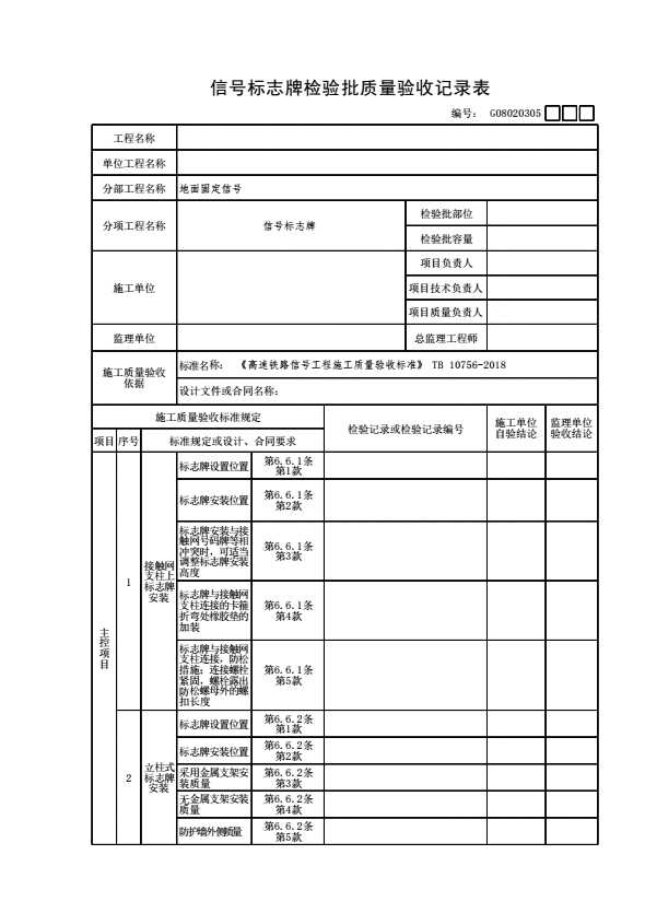表格名称:G08020305 信号标志牌检验批质量验收记录表