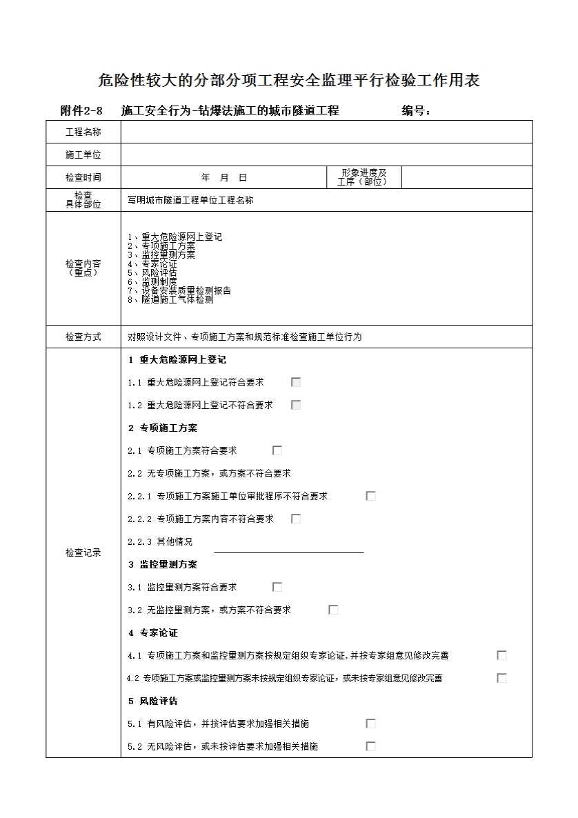 表格名称:附件2-8 施工安全行为-钻爆法施工的城市隧道工程