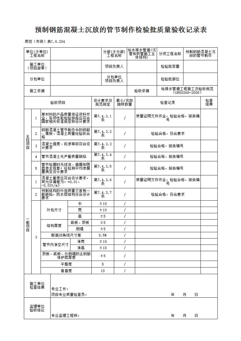 预制钢筋混凝土沉放的管节制作检验批质量验收记录表