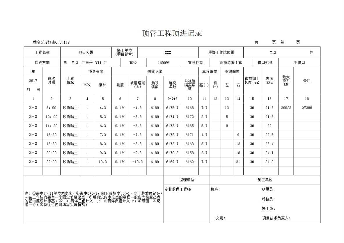 2 顶管工程顶进记录要求每测一次,记录一行,一般情况下起始段每 30cm 测一次,以后每 1m 测一次,管道发生偏差或地质情况发生变化时应增加测量次数,并在备注栏中记录纠偏情况。