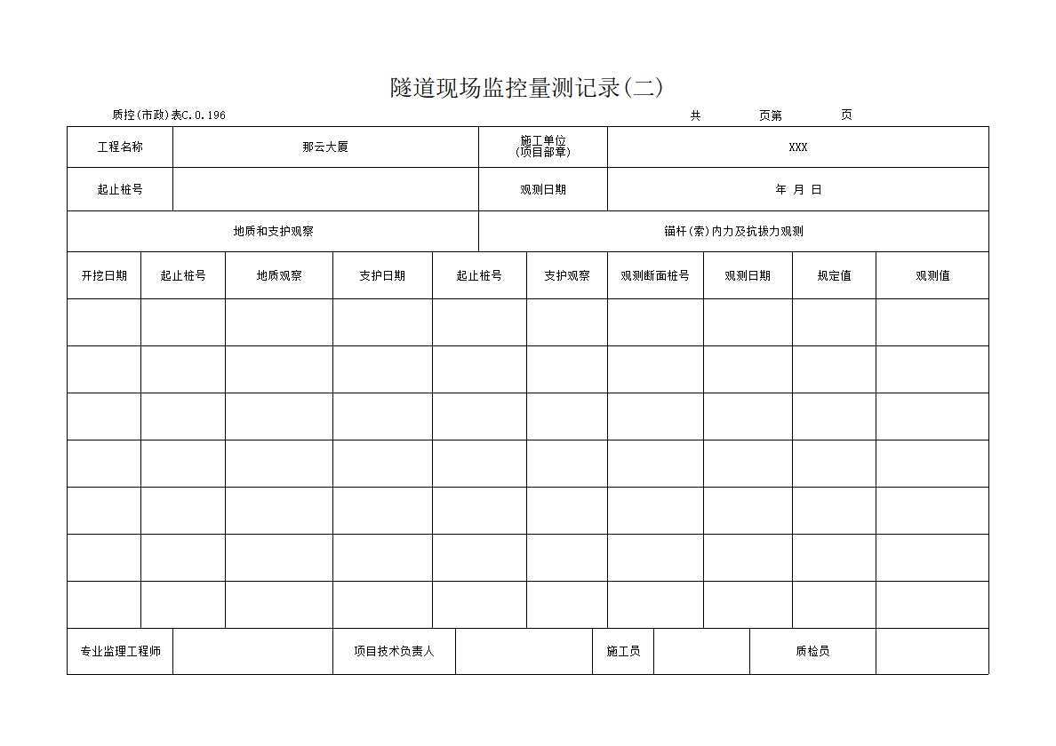 1 隧道现场监控量测记录包括洞口沉降监测、洞内沉降监测、洞内收敛检测、地质和支护观察、锚杆(索)内力及抗拔力观测、经地基处理的建筑物和构筑物及设计文件有沉降观测要求的工程,均应按单位工程提供现场监控量测记录(见附录 C 质控(市政)表 C.0.195)、(见附录 C 质控(市政)表 C.0.196)及沉降观测记录(见附录 C 质控(市政)表 C.0.154),并附有水准高程测量记录。记录应填写完整、齐全,数据真实,签证齐全,记录中的主要技术指标应符合设计要求。
