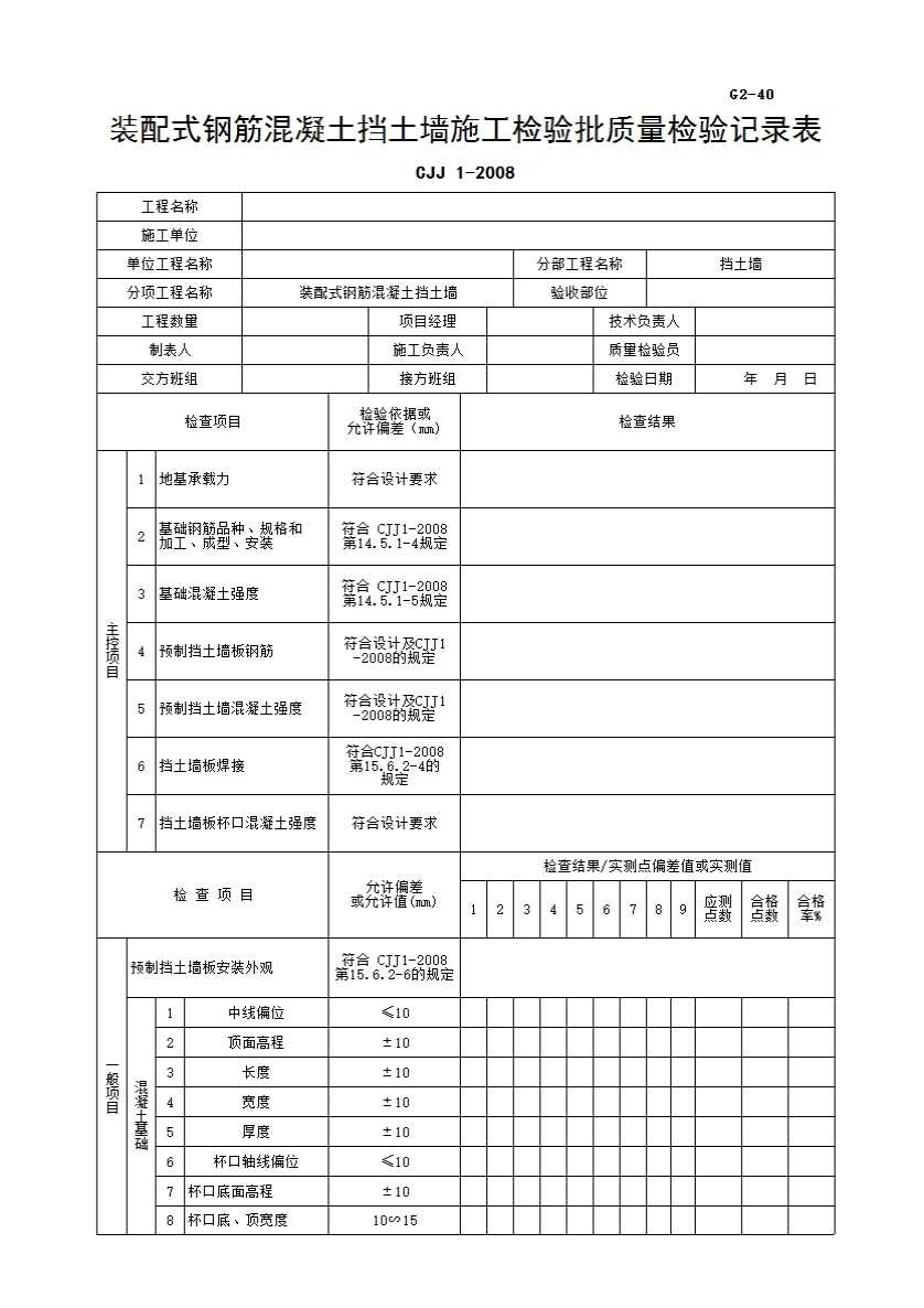 表格名称:装配式钢筋混凝土挡土墙施工检验批质量检验记录表