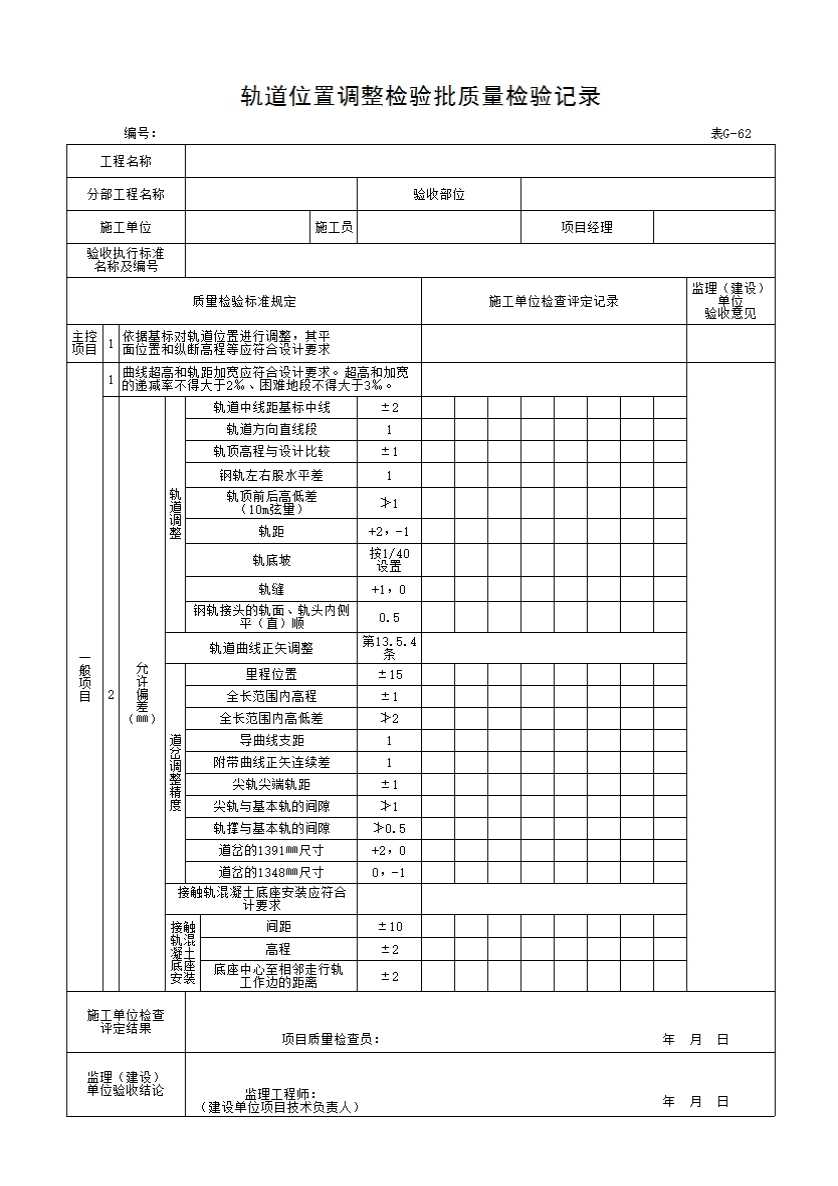 表格名称:表G-62 轨道位置调整检验批质量检验记录