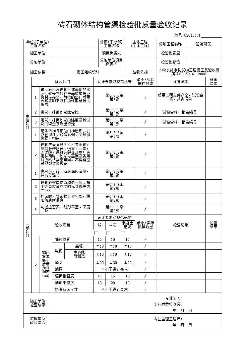 表格名称:02010401_砖石砌体结构管渠检验批质量验收记录