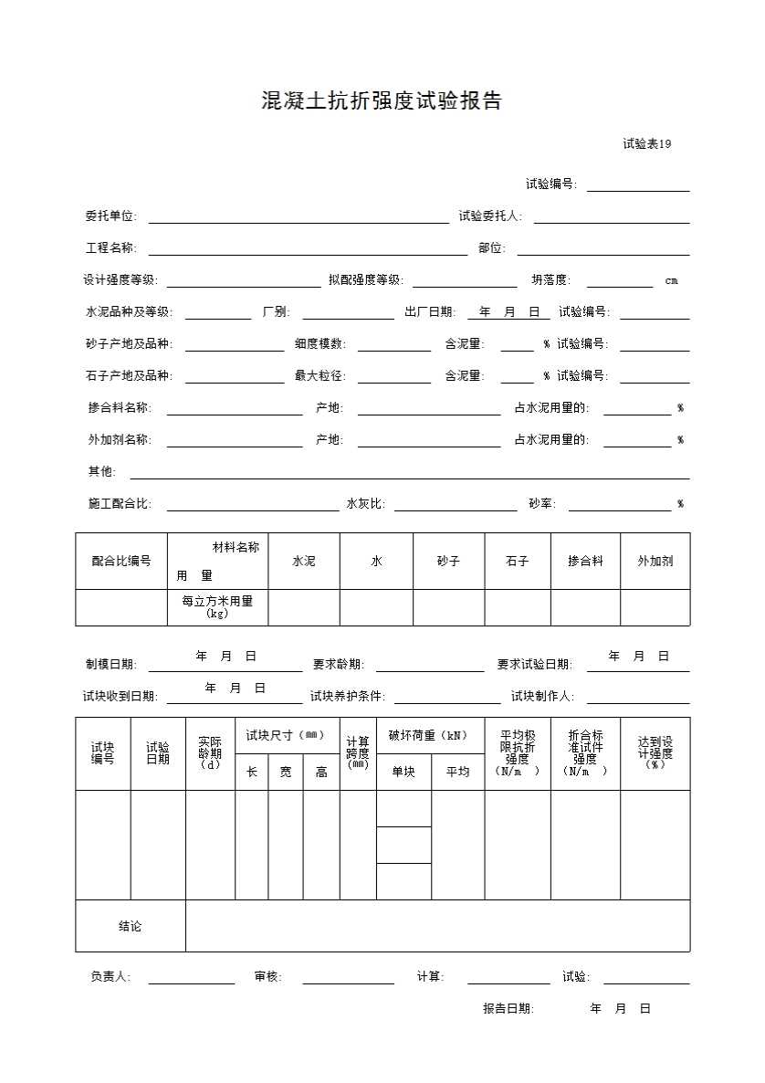 表格名称:试验表19 混凝土抗折强度试验报告