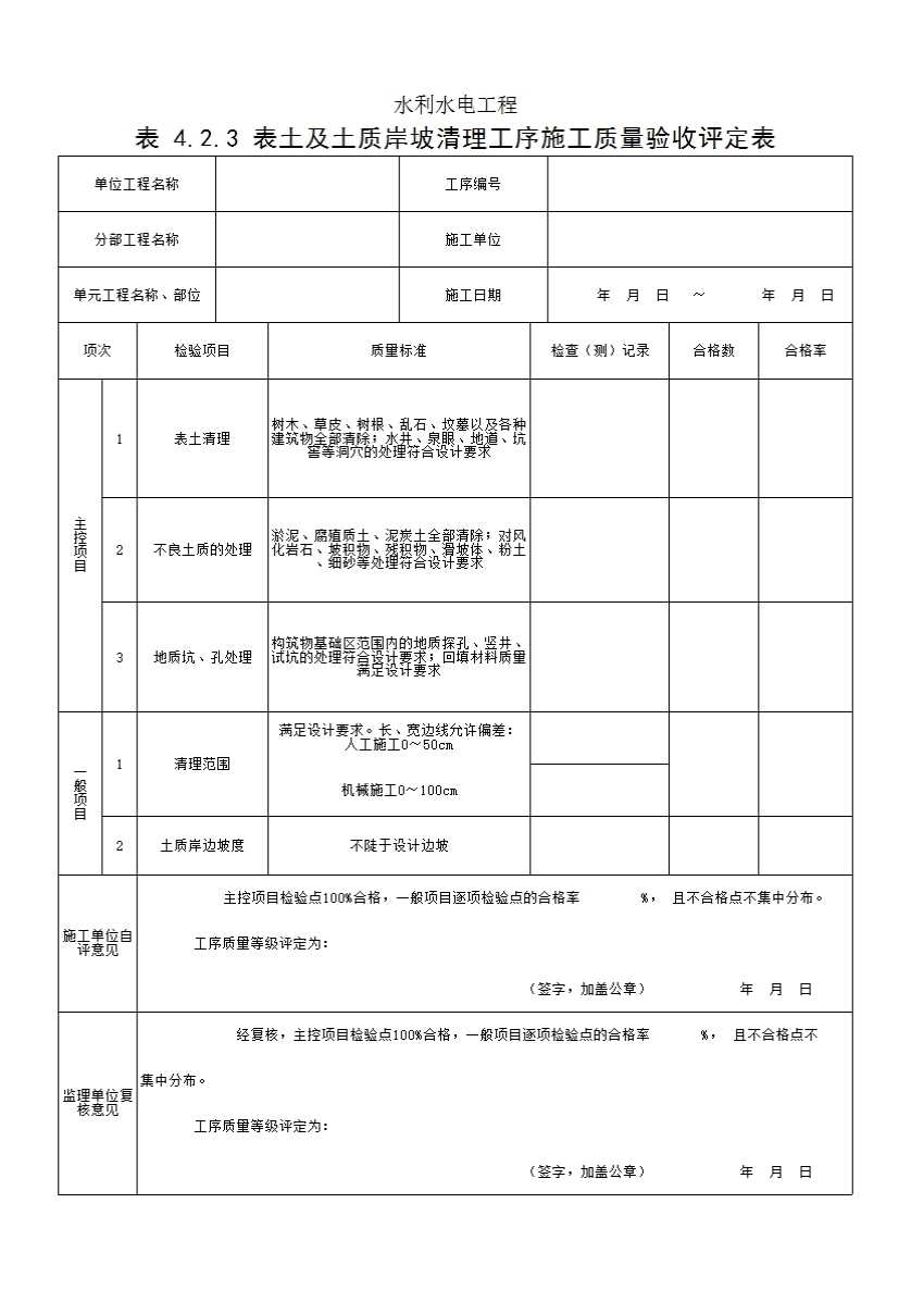 表格名称:表 4.2.3 表土及土质岸坡清理工序施工质量验收评定表