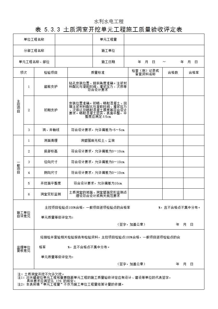表 5.3.3 土质洞室开挖单元工程施工质量验收评定表