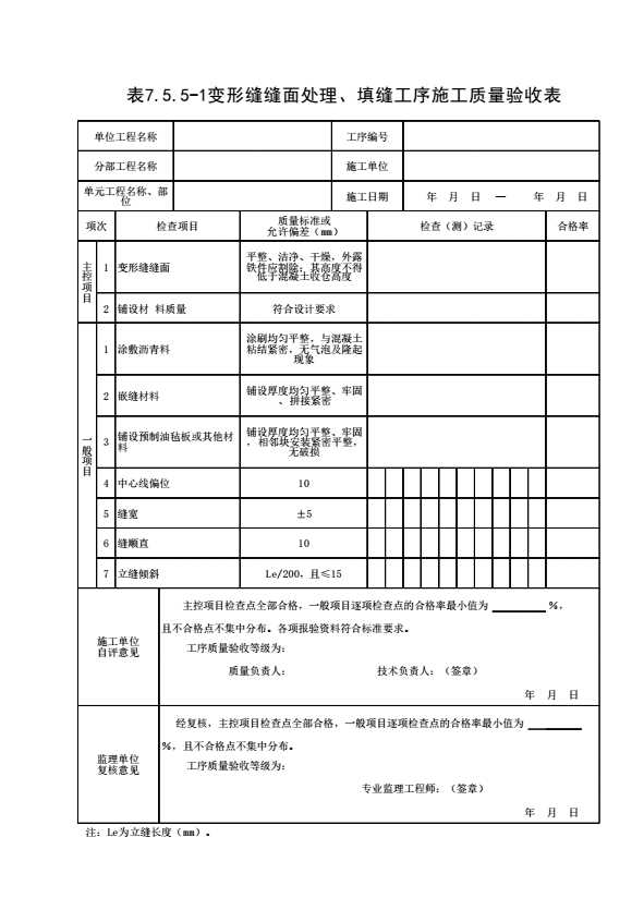 表格名称:表7.5.5-1 变形缝缝面处理、填缝工序施工质量验收表
