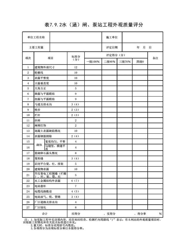 表格名称:表7.9.2 水(涵)闸、泵站工程外观质量评分