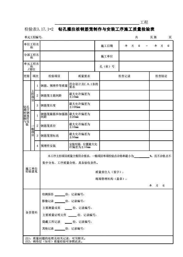 表格名称:表3.17.1-2 钻孔灌注桩钢筋笼制作与安装工序施工质量检验表