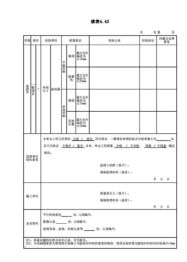 表4.43 浆砌石、灌砌石挡墙浆砌体单元工程施工质量验收表