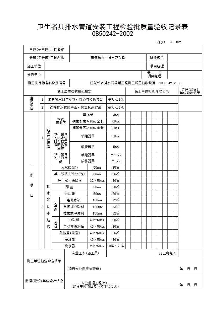 表格名称:168 卫生器具排水管道安装工程检验批质量验收记录表