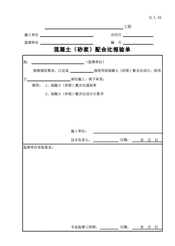 表格名称:D.1.16 混凝土(砂浆)配合比报验单