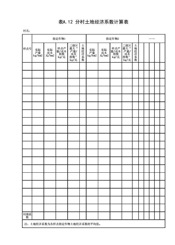 表格名称:表A.12 分村土地经济系数计算表