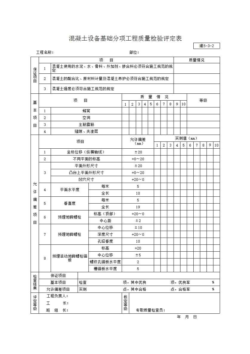 表格名称:混凝土设备基础分项工程质量检验评定表