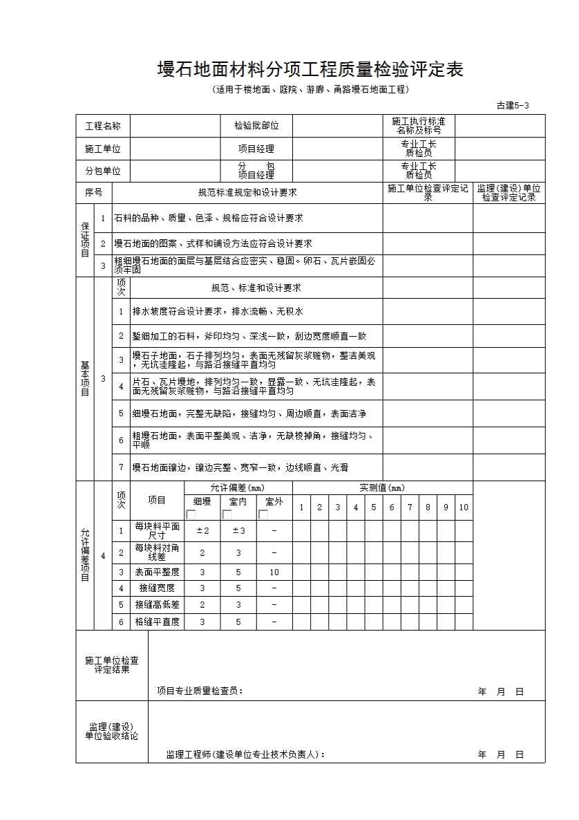 表格名称:古建5-3 墁石地面材料分项工程质量检验评定表