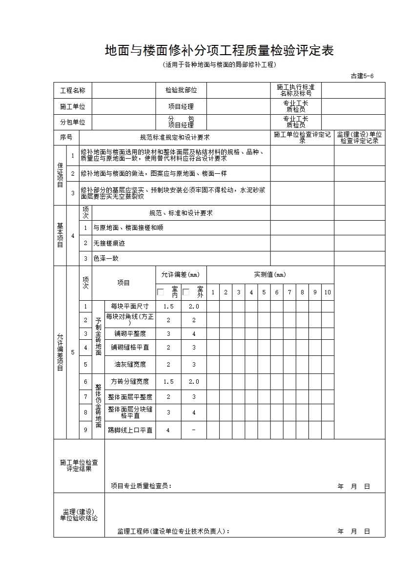 表格名称:古建5-6 地面与楼面修补分项工程质量检验评定表
