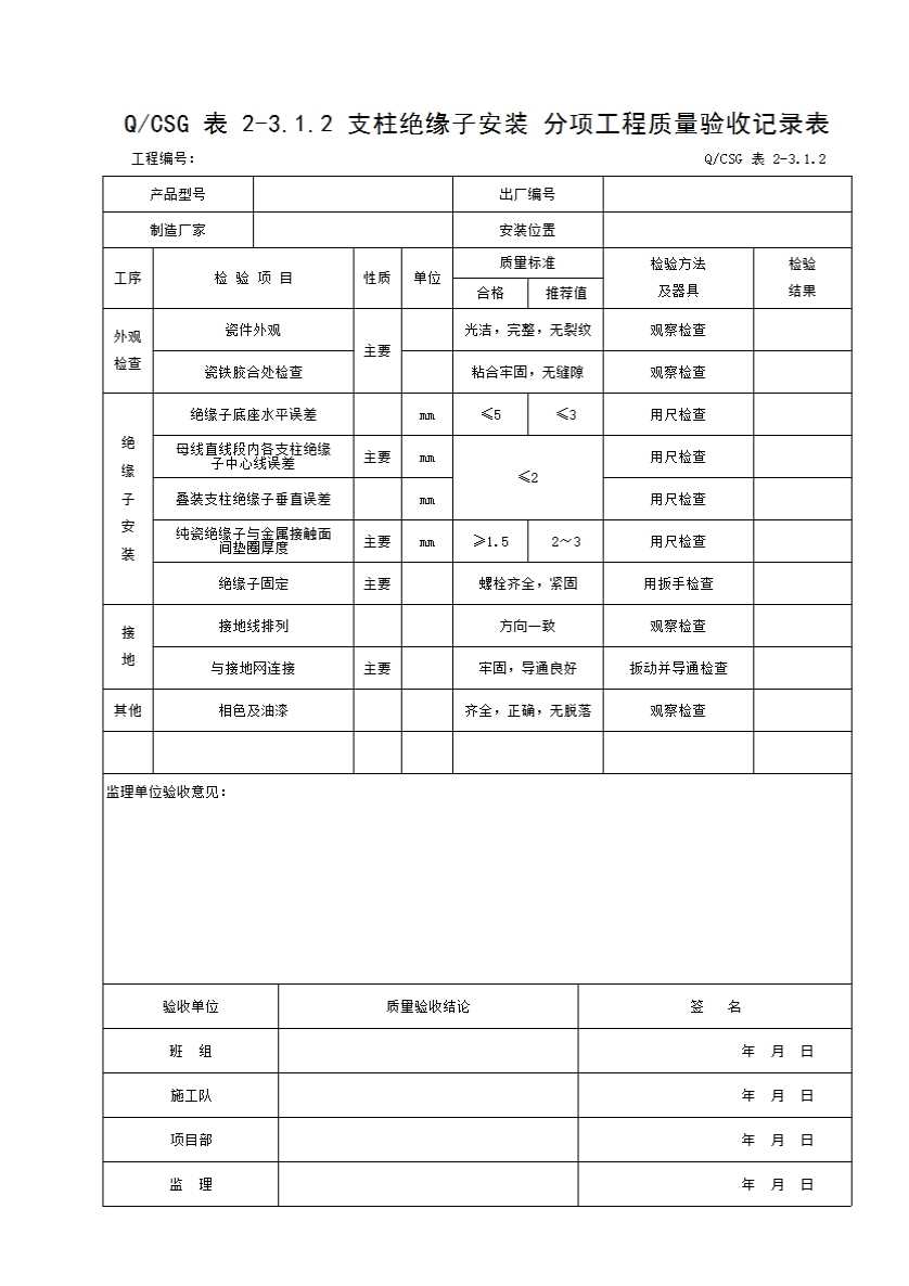 QCSG 表 2-3.1.2 支柱绝缘子安装 分项工程质量验收记录表