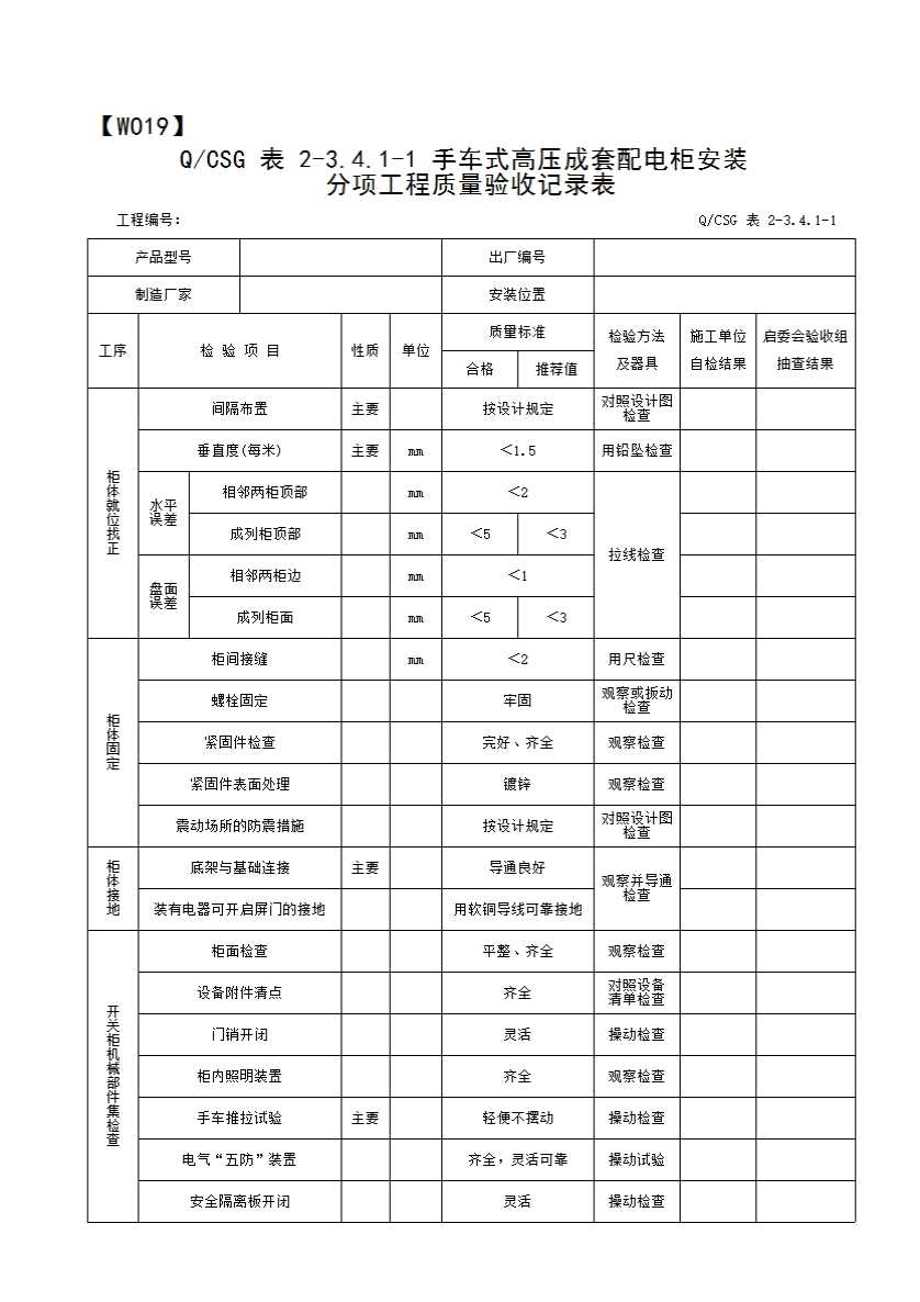 表格名称:QCSG 表 2-3.4.1-1 手车式高压成套配电柜安装 分项工程质量验收记录表