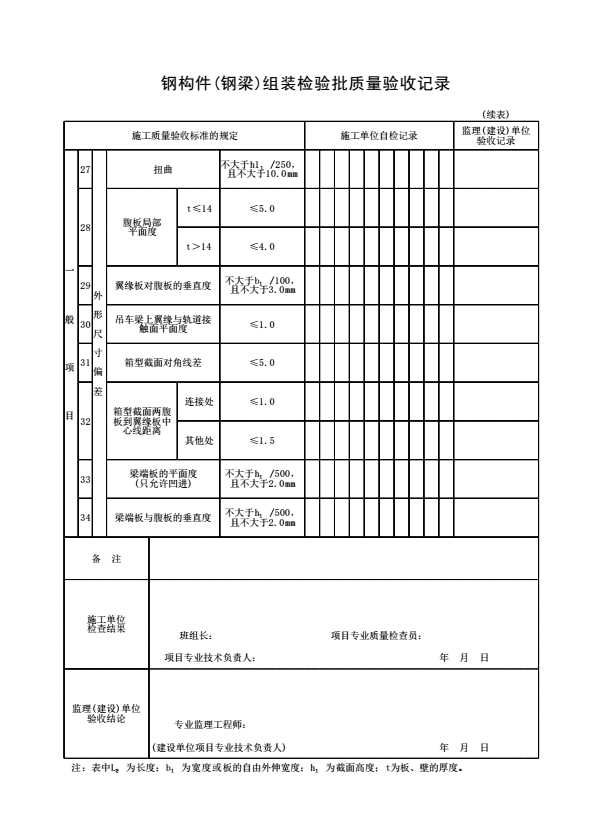 表格名称:钢构件(钢梁)组装检验批质量验收记录