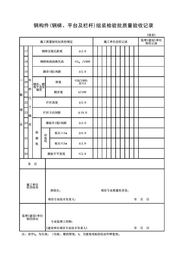 表格名称:钢构件(钢梯、平台及栏杆)组装检验批质量验收记录