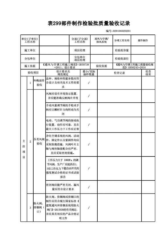 表格名称:020106020201 部件制作检验批质量验收记录