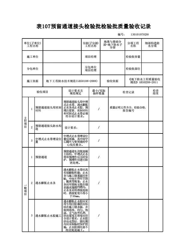 表格名称:130101070206 预留通道接头检验批检验批质量验收记录