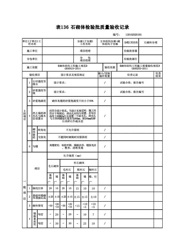 表格名称:130102020301 石砌体检验批质量验收记录