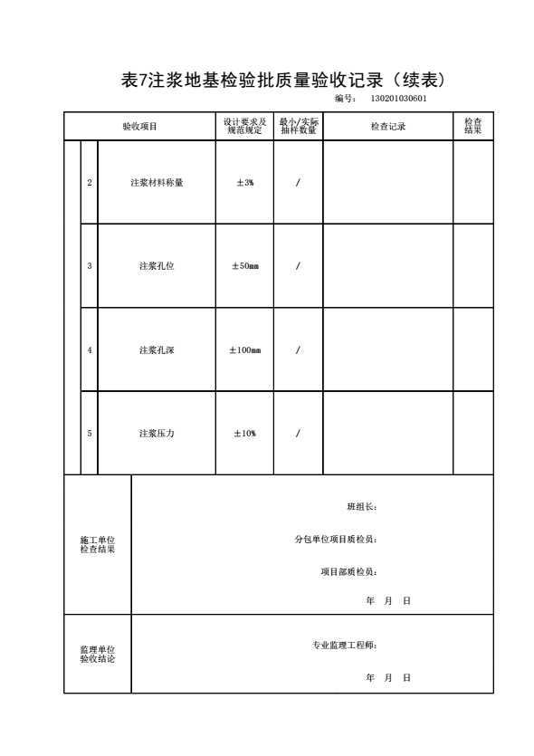 表格名称:130201030601 注浆地基检验批质量验收记录