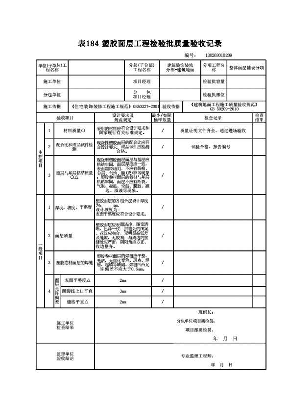 表格名称:130203010209 塑胶面层工程检验批质量验收记录