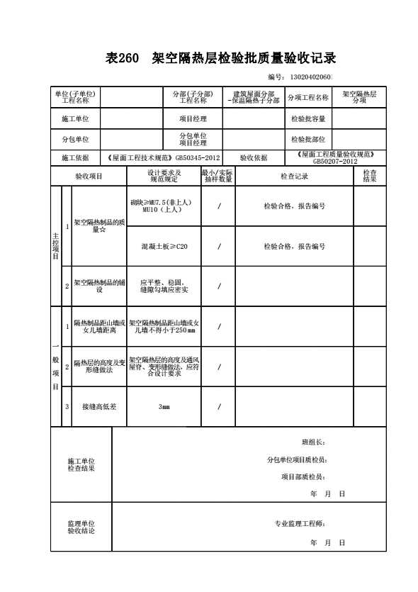 表格名称:130204020601 架空隔热层检验批质量验收记录