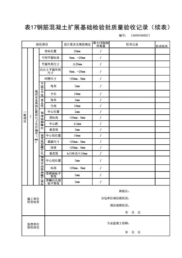 表格名称:130301060217 钢筋混凝土扩展基础检验批质量验收记录