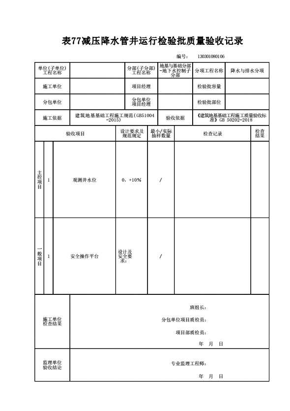 表格名称:130301080106 减压降水管井运行检验批质量验收记录