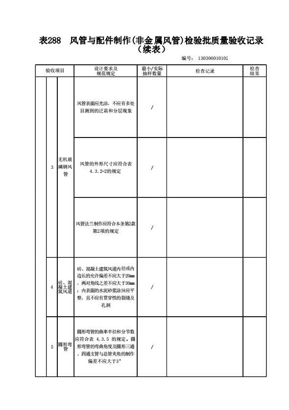 表格名称:130306010102 风管与配件制作(非金属风管)检验批质量验收记录