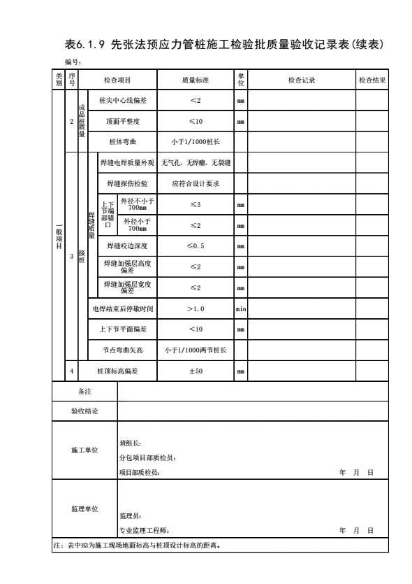 表格名称:表6.1.9 先张法预应力管桩施工检验批质量验收记录表