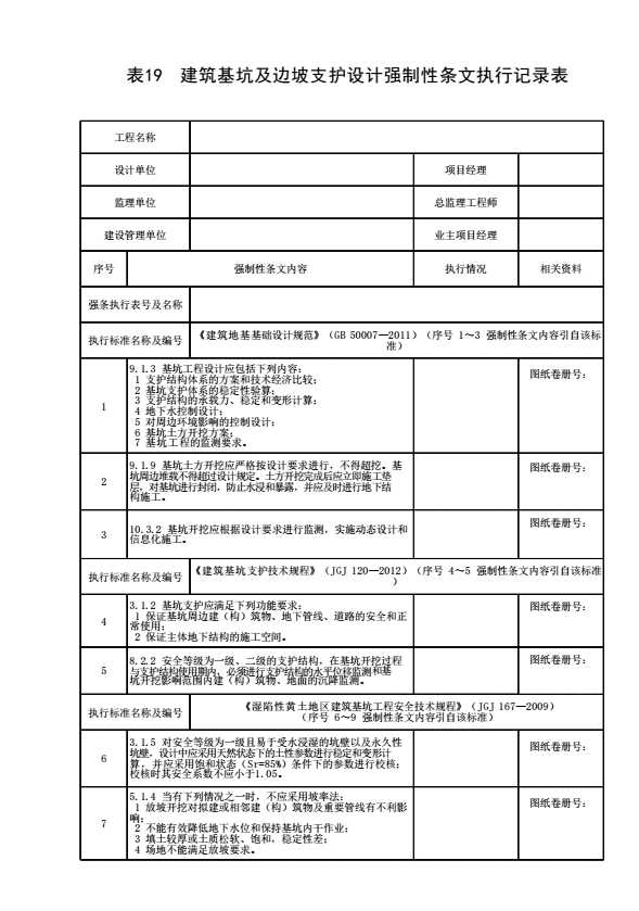 表格名称:表19 建筑基坑及边坡支护设计强制性条文执行记录表