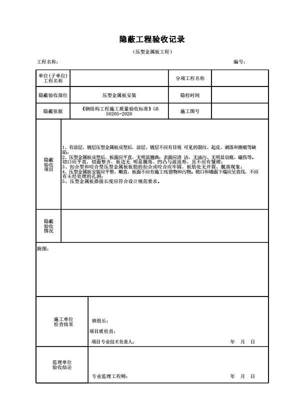 表格名称:隐蔽工程验收记录(压型金属板工程)