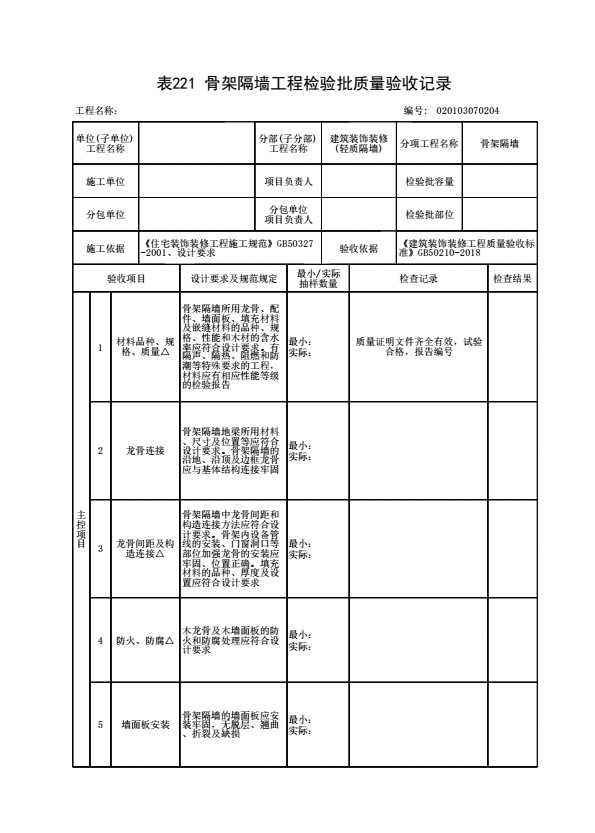 表格名称:020103070204 骨架隔墙工程检验批质量验收记录