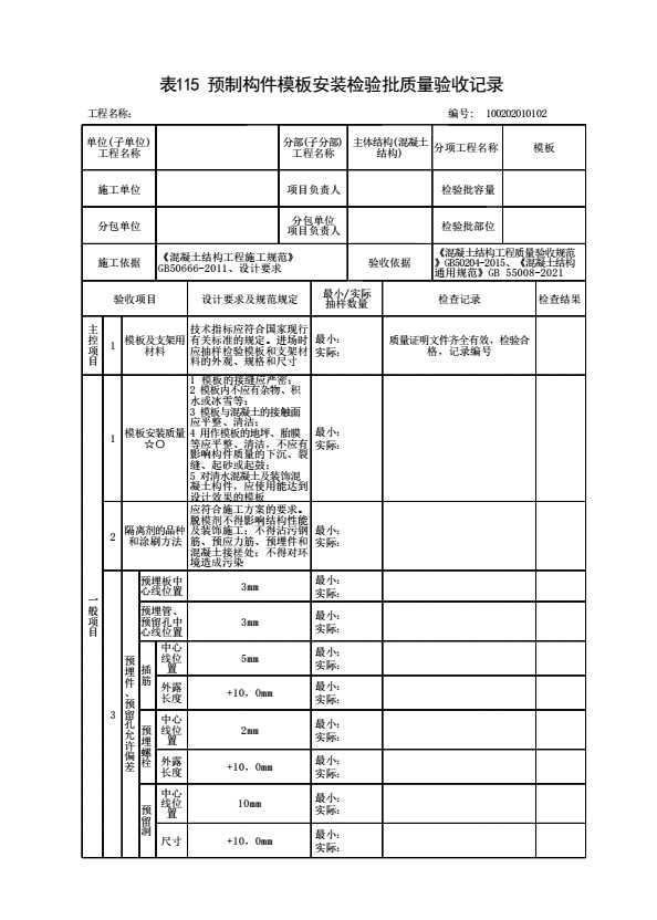 表格名称:100202010102 预制构件模板安装检验批质量验收记录