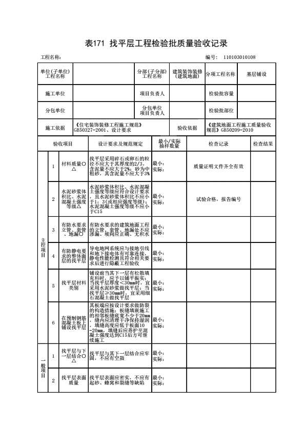 表格名称:110103010108 找平层工程检验批质量验收记录