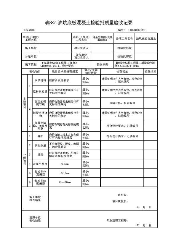 表格名称:110201070201 油坑底板混凝土检验批质量验收记录