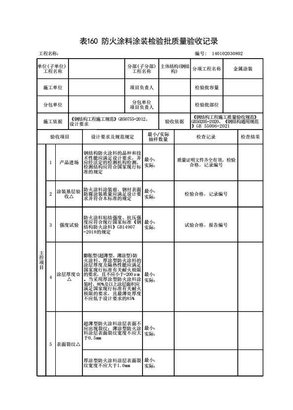 表格名称:140102030802 防火涂料涂装检验批质量验收记录