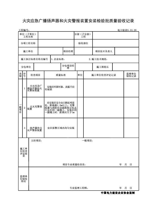 表格名称:电土验表5.33.28 火灾应急广播扬声器和火灾警报装置安装检验批质量验收记录